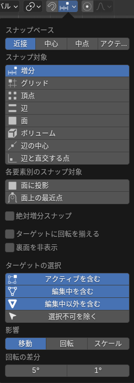 オブジェクトを移動させるとき、「ctrl」を押しながら動かすと刻んで移動するようになる。「グリッド」にするとメモリに沿ってオブジェクトが移動するということらしい。便利だが、このスナップボタンの存在を忘れそう。