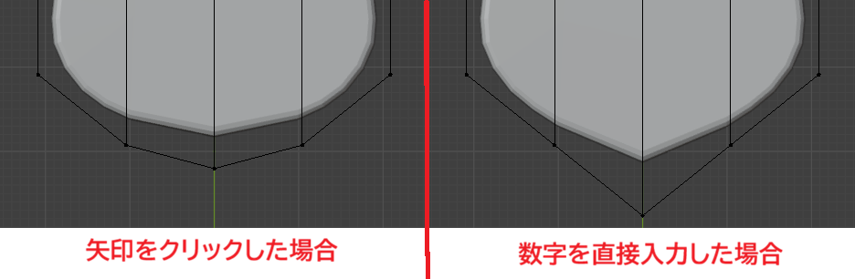動かした後に分割数を変更すると角が柔らかくなるが、数字を直接入力した場合とオブジェクトデータプロパティからクリックで数字を変えた場合とで形が変わる。