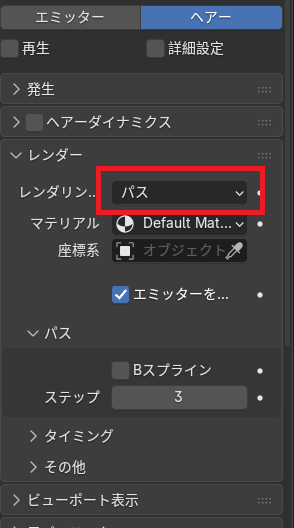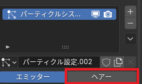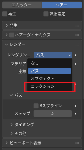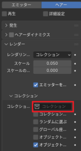 を選択して「+」を押してパーティクルシステムを作る。その後、ヘアーを選択し、レンダリング方法(途切れてるけど)を今回は「コレクション」にする。