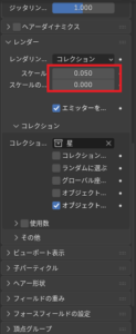 あとは「発生」の中の「数」を調整したり、「レンダー」の中の「スケール」や「スケールのランダム化」(いずれも途切れているけど)で調節する。