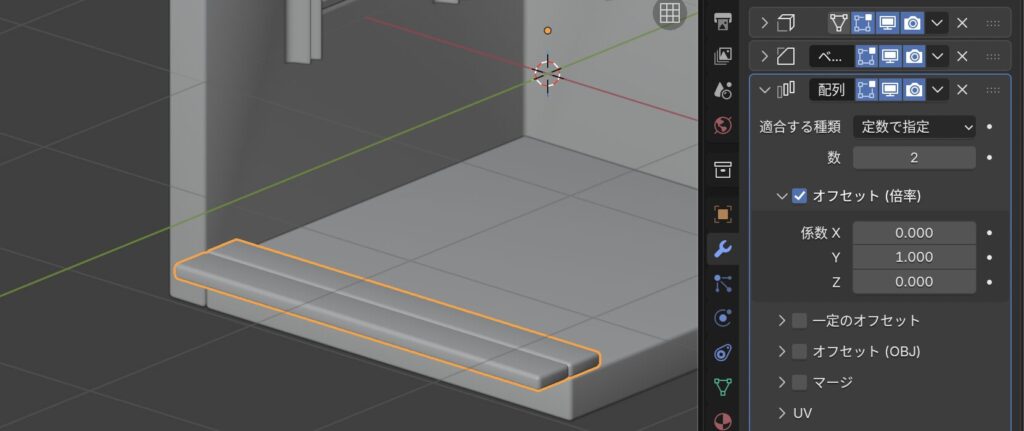 ここでは、教科書は配列のオフセット値をY軸に1.0で入力するとのことだったが、1を入れると手前にずれていく。ここでは−1で入力すると教科書通りになるためそのようにした。