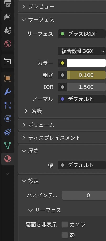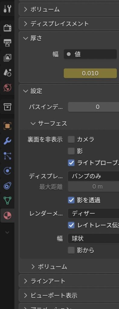 マテリアルプロパティの「厚さ」のところが「デフォルト」になっている。