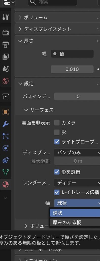 マテリアルプロパティの「設定」にある幅の項目が、「球状」になっているので、これを「厚みのある板」に変える。