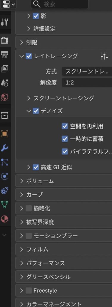 さらにレンダープロパティのレイトレーシングの中の解像度が1:2になっているため、これを1:1にする。
