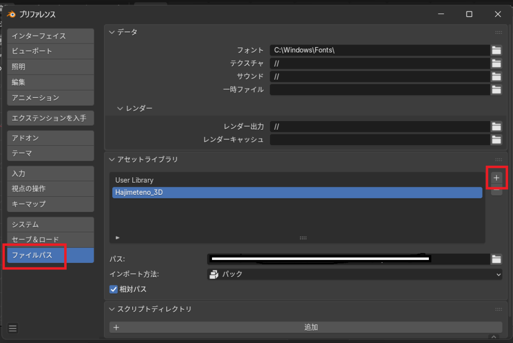 ファイルパス→アセットライブラリの「+」から.blendファイルがあるフォルダを追加する。