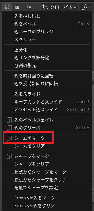 シームをマークしたい辺を選択した状態で、「辺」メニュー→シームをマークを選択