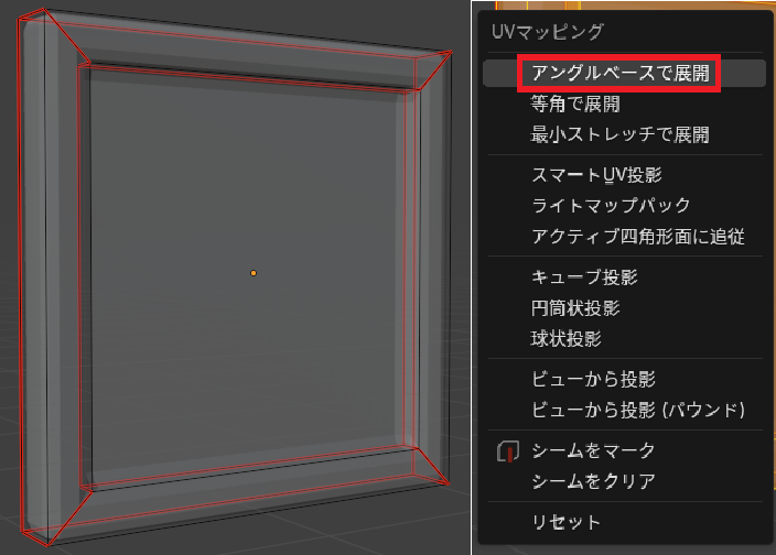 必要な部分にシームをマークしたら「A」を押してすべて選択して「U」キー→「アングルベースで展開」を押す。