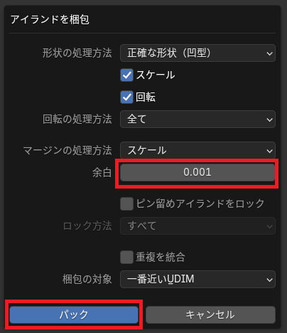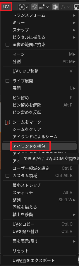 UVメニューから「アイランドを梱包」を選択。これによって、UVマップ上の配置を効率よく配置してくれる・・・らしい。