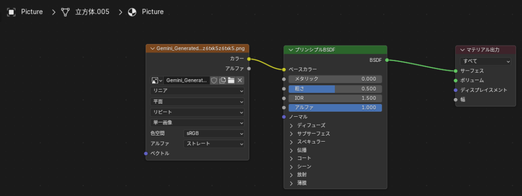 左上の「Picture」じゃなくて額縁のマテリアルのシェーダーに張り付けて額縁に反映されてしまったのもいい思い出。