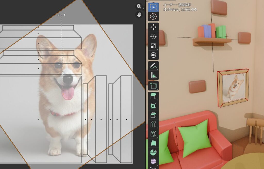 ここは好きな絵を飾れるので、今回はコーギーの画像を額縁に飾ろう!