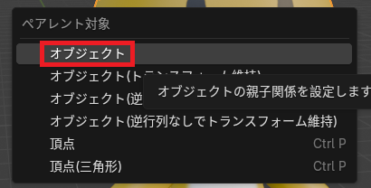 一緒についてきてもらいたいオブジェクトをすべて選択→最後に根本のオブジェクトを選択→「ctrl」 + 「P」でペアレントを実行し、「オブジェクト」を選択。