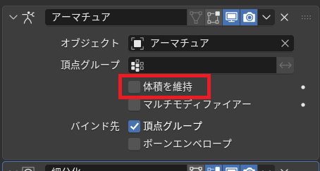 関連付けると、オブジェクトのモディファイアープロパティに「アーマチュア」が追加されている。ここの「体積を維持」にチェックを入れる。
