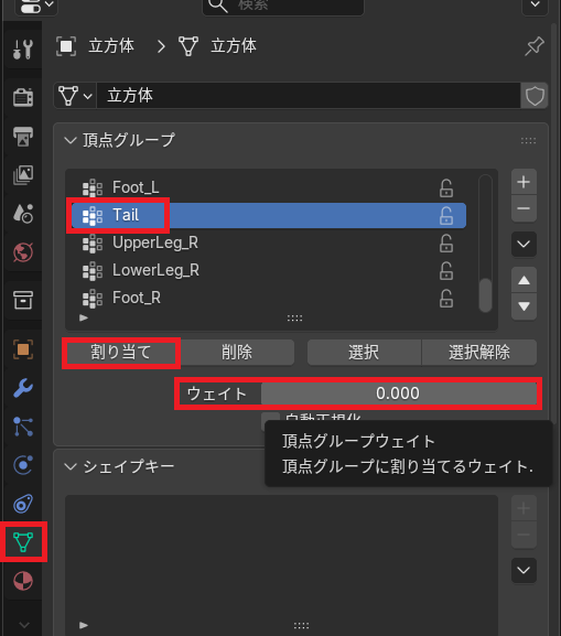 影響を受けたくないオブジェクトの頂点を全選択→データプロパティの頂点グループを選択し、ウェイトを0にしたあとに「割り当て」を押す。