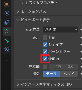 ビューポート表示の「最前面」にチェックを入れるとボーンが前に出てくる。