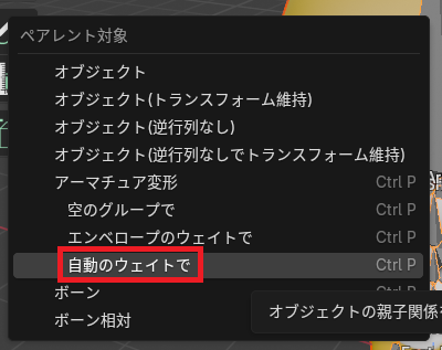 オブジェクトモードにして、オブジェクトを選択してからアーマチュアを選択→「ctrl」 + 「P」→「自動のウェイトで」を選択